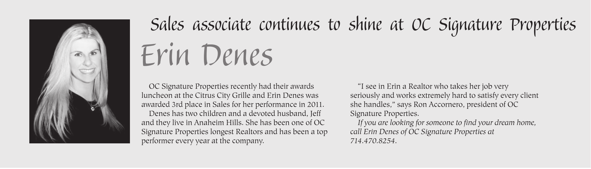 Sales associate continues to shine at OC Signature Properties Erin Denes OC Signature Properties recently had their awards luncheon at the Citrus City Grille and Erin Denes was awarded 3rd place in Sales for her performance in 2011. Denes has two children and a devoted husband, Jeff and they live in Anaheim Hills. She has been one of OC Signature Properties longest Realtors and has been a top performer every year at the company. “I see in Erin a Realtor who takes her job very seriously and works extremely hard to satisfy every client she handles,” says Ron Accornero, president of OC Signature Properties. If you are looking for someone to find your dream home, call Erin Denes of OC Signature Properties at 714.470.8254.