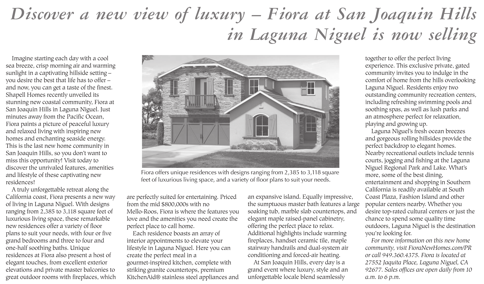 Imagine starting each day with a cool sea breeze, crisp morning air and warming sunlight in a captivating hillside setting – you desire the best that life has to offer – and now, you can get a taste of the finest. Shapell Homes recently unveiled its stunning new coastal community, Fiora at San Joaquin Hills in Laguna Niguel. Just minutes away from the Pacific Ocean, Fiora paints a picture of peaceful luxury and relaxed living with inspiring new homes and enchanting seaside energy. This is the last new home community in San Joaquin Hills, so you don’t want to miss this opportunity! Visit today to discover the unrivaled features, amenities and lifestyle of these captivating new residences!