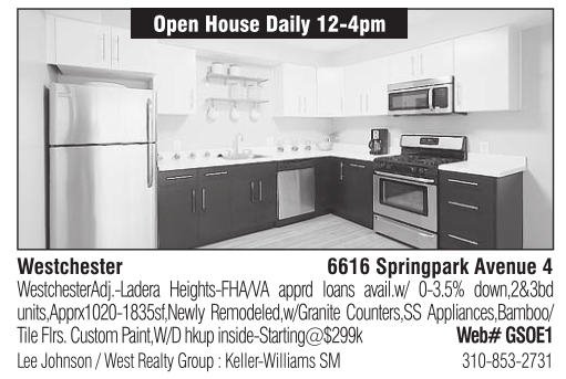 Westchester 6616 Springpark Avenue 4 WestchesterAdj.-Ladera Heights-FHA/VA apprd loans avail.w/ 0-3.5% down,2&3bd units,Apprx1020-1835sf,Newly Remodeled,w/Granite Counters,SS Appliances,Bamboo/ Tile Flrs. Custom Paint,W/D hkup inside-Starting@$299k Web# GSOE1