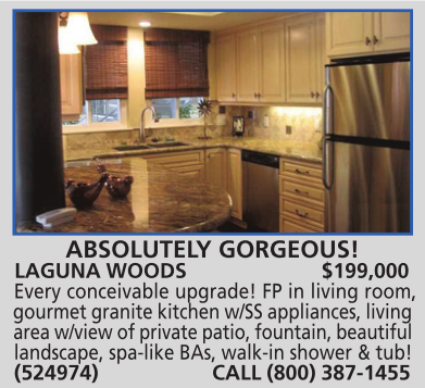ABSOLUTELY GORGEOUS! LAGUNA WOODS $199,000 Every conceivable upgrade! FP in living room, gourmet granite kitchen w/SS appliances, living area w/view of private patio, fountain, beautiful landscape, spa-like BAs, walk-in shower & tub! (524974) CALL (800) 387-1455