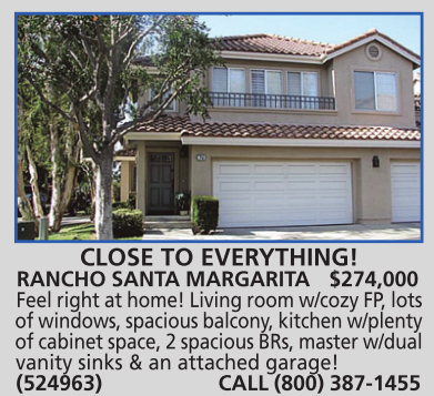 RANCHO SANTA MARGARITA $274,000 Feel right at home! Living room w/cozy FP, lots of windows, spacious balcony, kitchen w/plenty of cabinet space, 2 spacious BRs, master w/dual vanity sinks & an attached garage! (524963) CALL (800) 387-1455