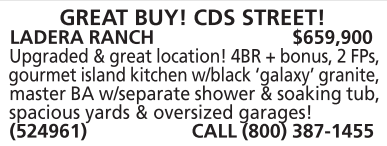 LADERA RANCH $659,900 Upgraded & great location! 4BR + bonus, 2 FPs, gourmet island kitchen w/black ‘galaxy’ granite, master BA w/separate shower & soaking tub, spacious yards & oversized garages! (524961) CALL (800) 387-1455