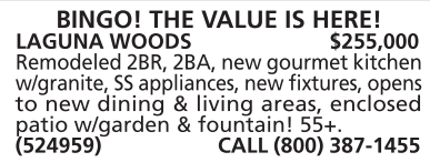 LAGUNA WOODS $255,000 Remodeled 2BR, 2BA, new gourmet kitchen w/granite, SS appliances, new fixtures, opens to new dining & living areas, enclosed patio w/garden & fountain! 55+. (524959) CALL (800) 387-1455