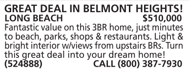 GREAT DEAL IN BELMONT HEIGHTS! LONG BEACH $510,000 Fantastic value on this 3BR home, just minutes to beach, parks, shops & restaurants. Light & bright interior w/views from upstairs BRs. Turn this great deal into your dream home! (524888) CALL (800) 387-7930