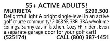 55+ ACTIVE ADULTS! MURRIETA $299,500 Delightful light & bright single-level in an active golf course community! 2,068 SF, 3BR, 3BA w/volume ceilings. Sunny eat-in kitchen. Cozy FP in den. Even a separate garage door for your golf cart! (525174) CALL (800) 387-1451