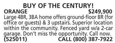 BUY OF THE CENTURY! ORANGE $249,900 Large 4BR, 3BA home offers ground-floor BR (for office or guests) & 3 upstairs. Superior location within the community. Fenced yard w/a 2-car garage. Don’t miss the opportunity. Call now. (525011) CALL (800) 387-7922
