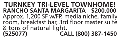RANCHO SANTA MARGARITA $200,000 Approx. 1,200 SF w/FP, media niche, family room, breakfast bar, 3rd floor master suite & tons of natural light.