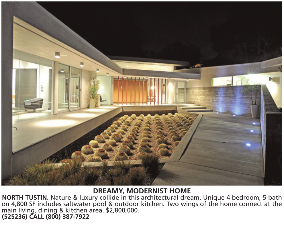 DREAMY, MODERNIST HOME NORTH TUSTIN. Nature & luxury collide in this architectural dream. Unique 4 bedroom, 5 bath on 4,800 SF includes saltwater pool & outdoor kitchen. Two wings of the home connect at the main living, dining & kitchen area. $2,800,000. (525236) CALL (800) 387-7922