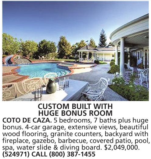 CUSTOM BUILT WITH HUGE BONUS ROOM COTO DE CAZA. 5 bedrooms, 7 baths plus huge bonus. 4-car garage, extensive views, beautiful wood flooring, granite counters, backyard with fireplace, gazebo, barbecue, covered patio, pool, spa, water slide & diving board. $2,049,000. (524971) CALL (800) 387-1455