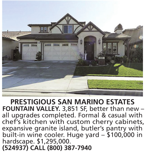 PRESTIGIOUS SAN MARINO ESTATES FOUNTAIN VALLEY. 3,851 SF, better than new – all upgrades completed. Formal & casual with chef’s kitchen with custom cherry cabinets, expansive granite island, butler’s pantry with built-in wine cooler. Huge yard – $100,000 in hardscape. $1,295,000. (524937) CALL (800) 387-7940