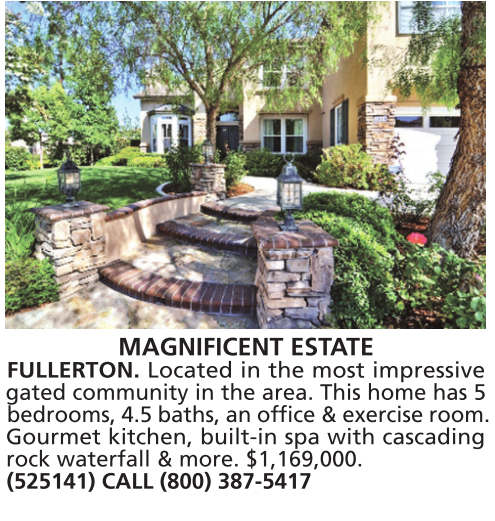 MAGNIFICENT ESTATE FULLERTON. Located in the most impressive gated community in the area. This home has 5 bedrooms, 4.5 baths, an office & exercise room. Gourmet kitchen, built-in spa with cascading rock waterfall & more. $1,169,000. (525141) CALL (800) 387-5417