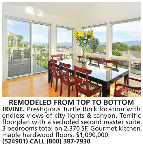 REMODELED FROM TOP TO BOTTOM IRVINE. Prestigious Turtle Rock location with endless views of city lights & canyon. Terrific floorplan with a secluded second master suite. 3 bedrooms total on 2,370 SF. Gourmet kitchen, maple hardwood floors. $1,090,000. (524901) CALL (800) 387-7930