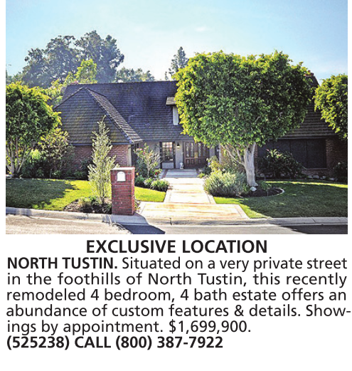 EXCLUSIVE LOCATION NORTH TUSTIN. Situated on a very private street in the foothills of North Tustin, this recently remodeled 4 bedroom, 4 bath estate offers an abundance of custom features & details. Showings by appointment. $1,699,900. (525238) CALL (800) 387-7922