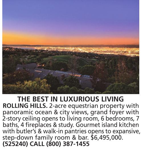 THE BEST IN LUXURIOUS LIVING ROLLING HILLS. 2-acre equestrian property with panoramic ocean & city views, grand foyer with 2-story ceiling opens to living room, 6 bedrooms, 7 baths, 4 fireplaces & study. Gourmet island kitchen with butler’s & walk-in pantries opens to expansive, step-down family room & bar. $6,495,000. (525240) CALL (800) 387-1455