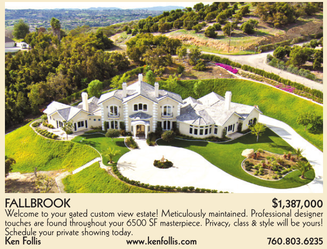 FALLBROOK $1,387,000 Welcome to your gated custom view estate! Meticulously maintained. Professional designer touches are found throughout your 6500 SF masterpiece. Privacy, class & style will be yours! Schedule your private showing today. Ken Follis www.kenfollis.com 760.803.6235
