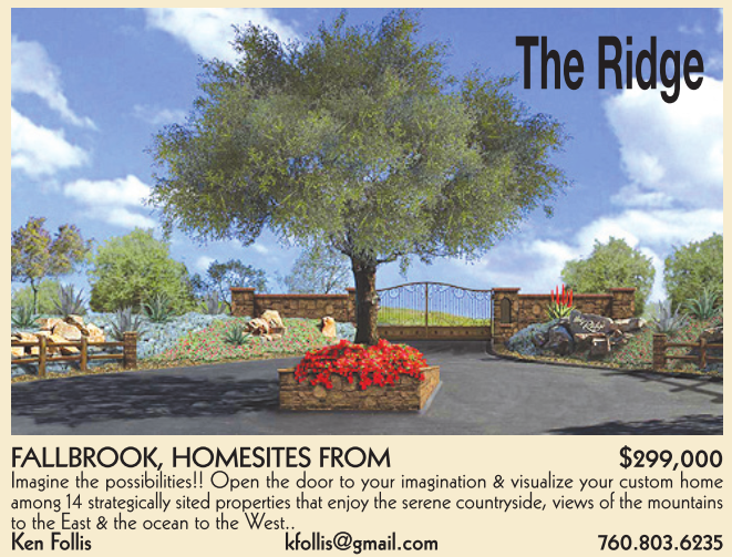 FALLBROOK, HOMESITES FROM $299,000 Imagine the possibilities!! Open the door to your imagination & visualize your custom home among 14 strategically sited properties that enjoy the serene countryside, views of the mountains to the East & the ocean to the West.. Ken Follis kfollis@gmail.com 760.803.6235