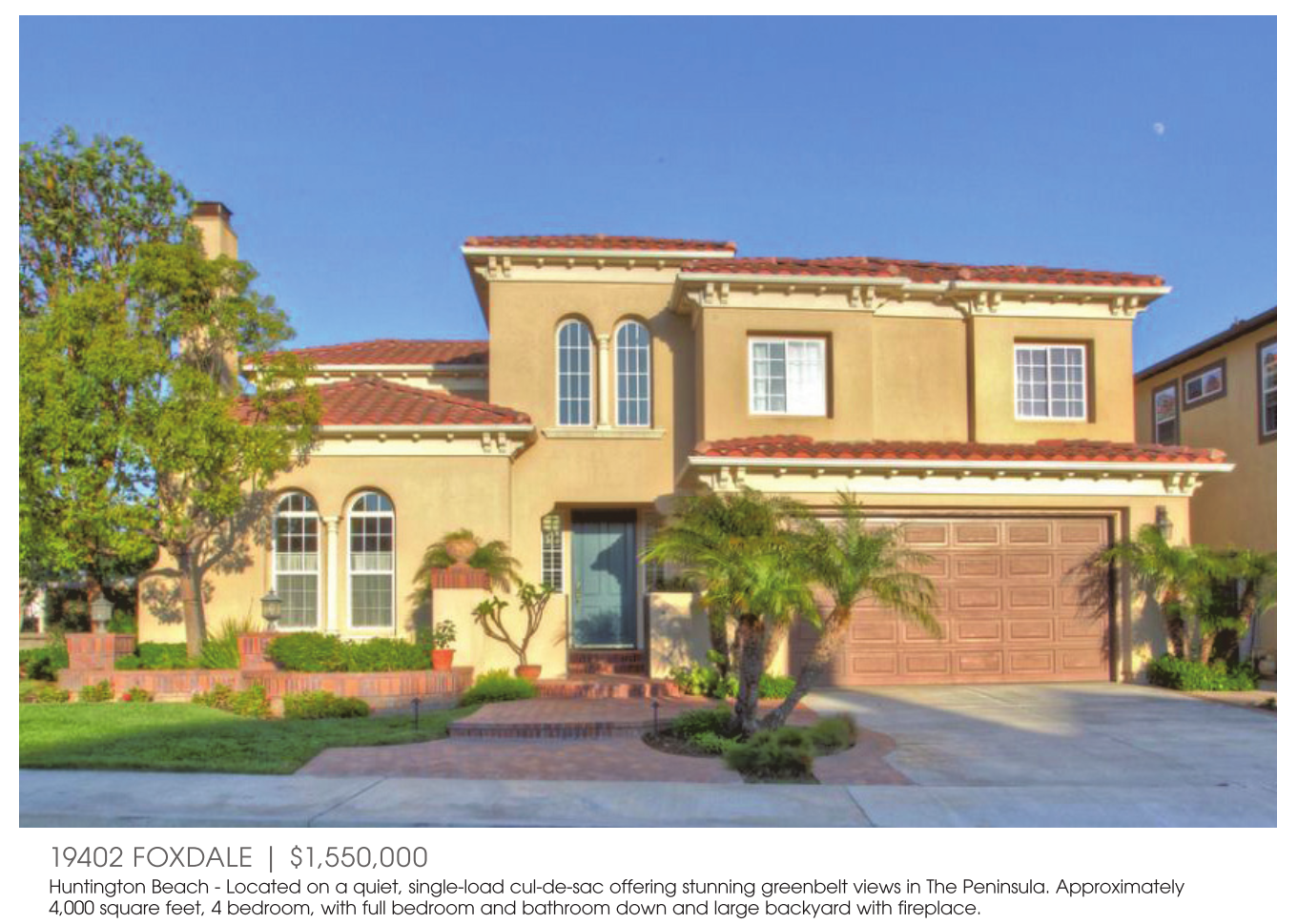 Huntington Beach - Located on a quiet, single-load cul-de-sac offering stunning greenbelt views in The Peninsula. Approximately 4,000 square feet, 4 bedroom, with full bedroom and bathroom down and large backyard with fireplace.