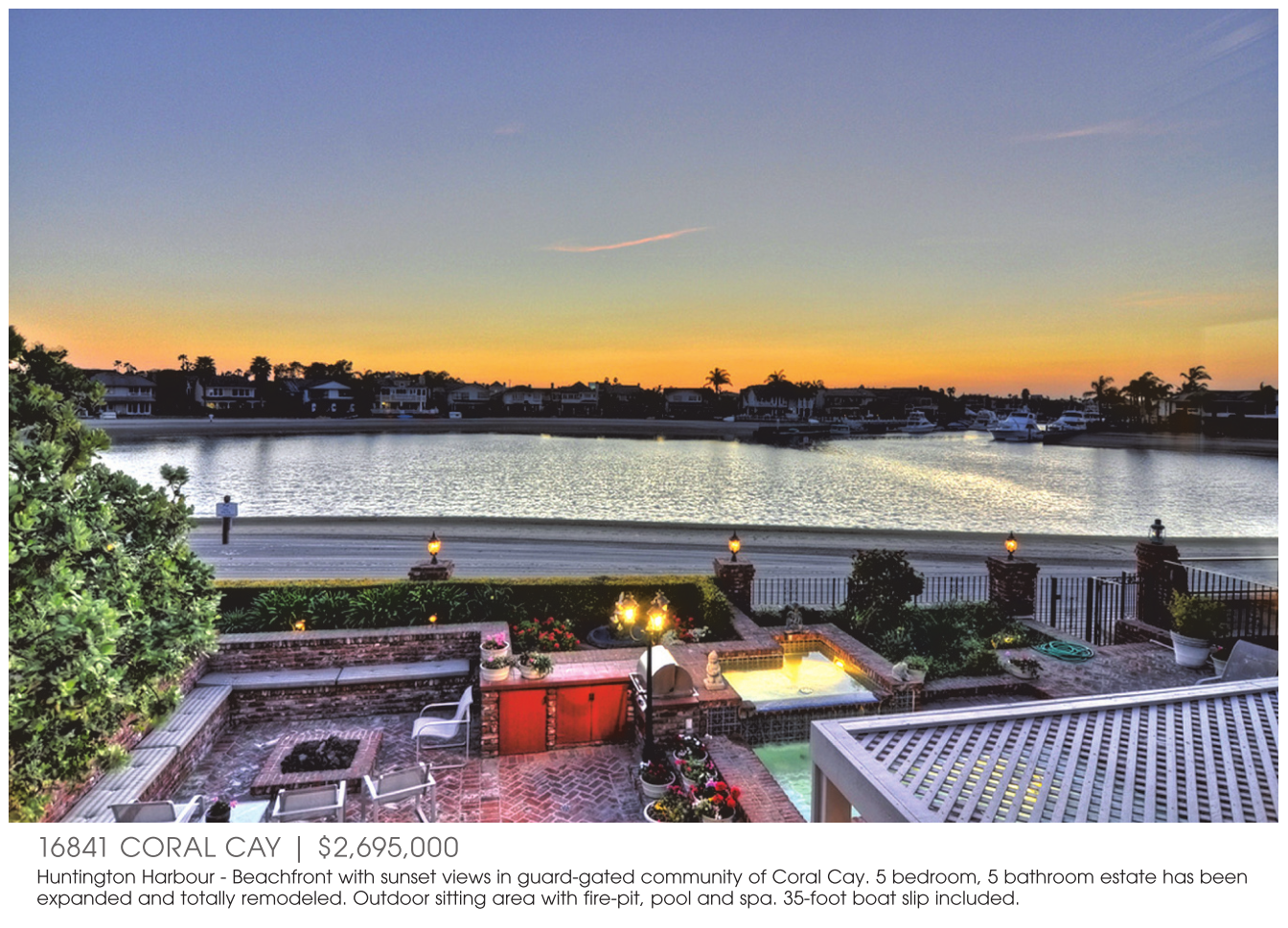 Huntington Harbour - Beachfront with sunset views in guard-gated community of Coral Cay. 5 bedroom, 5 bathroom estate has been expanded and totally remodeled. Outdoor sitting area with fire-pit, pool and spa. 35-foot boat slip included.