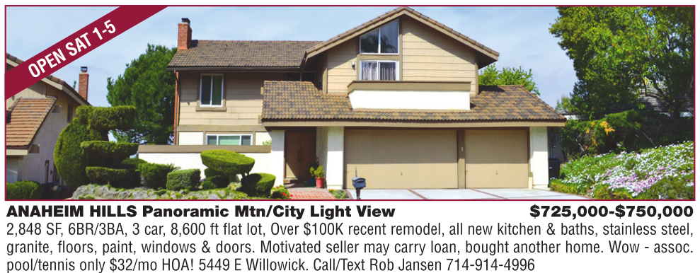 ANAHEIM HILLS Panoramic Mtn/City Light View $725,000-$750,000 2,848 SF, 6BR/3BA, 3 car, 8,600 ft flat lot, Over $100K recent remodel, all new kitchen & baths, stainless steel, granite, floors, paint, windows & doors. Motivated seller may carry loan, bought another home. Wow - assoc. pool/tennis only $32/mo HOA! 5449 E Willowick. Call/Text Rob Jansen 714-914-4996