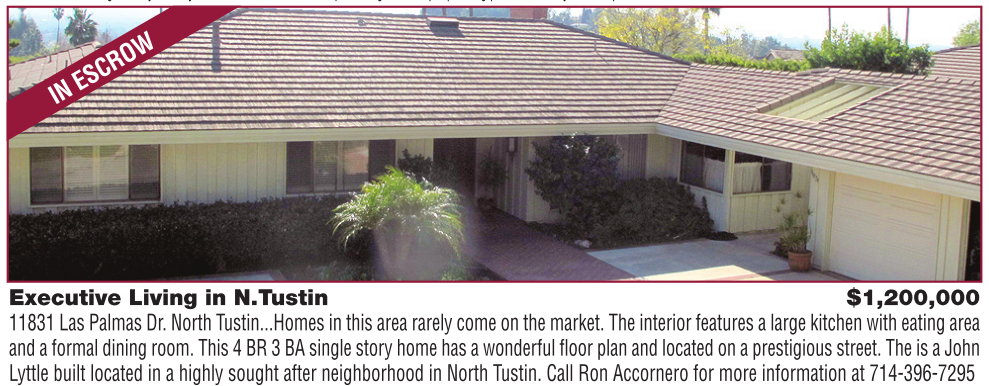 Executive Living in N.Tustin $1,200,000 11831 Las Palmas Dr. North Tustin...Homes in this area rarely come on the market. The interior features a large kitchen with eating area and a formal dining room. This 4 BR 3 BA single story home has a wonderful floor plan and located on a prestigious street. The is a John Lyttle built located in a highly sought after neighborhood in North Tustin. Call Ron Accornero for more information at 714-396-7295