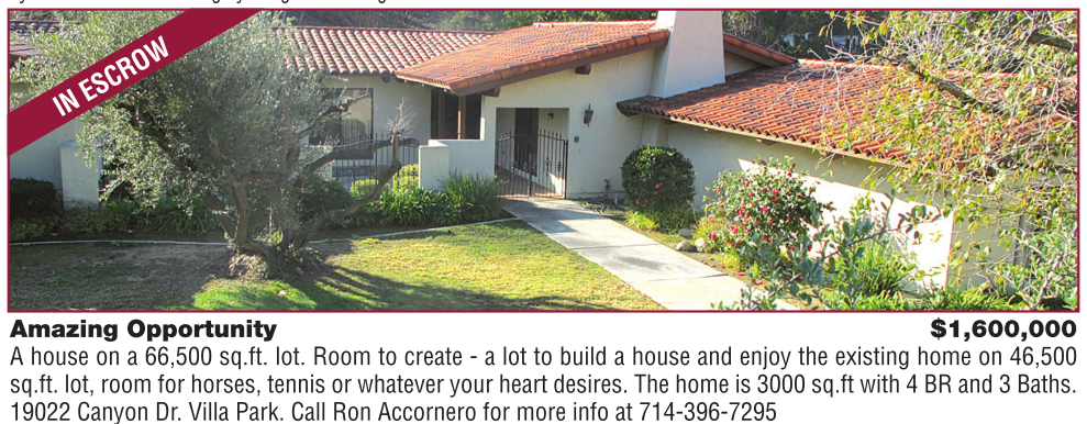 Amazing Opportunity $1,600,000 A house on a 66,500 sq.ft. lot. Room to create - a lot to build a house and enjoy the existing home on 46,500 sq.ft. lot, room for horses, tennis or whatever your heart desires. The home is 3000 sq.ft with 4 BR and 3 Baths. 19022 Canyon Dr. Villa Park. Call Ron Accornero for more info at 714-396-7295