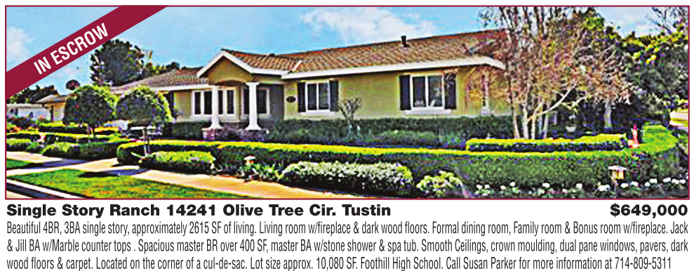 Single Story Ranch 14241 Olive Tree Cir. Tustin $649,000 Beautiful 4BR, 3BA single story, approximately 2615 SF of living. Living room w/fi replace & dark wood floors. Formal dining room, Family room & Bonus room w/fi replace. Jack & Jill BA w/Marble counter tops . Spacious master BR over 400 SF, master BA w/stone shower & spa tub. Smooth Ceilings, crown moulding, dual pane windows, pavers, dark wood floors & carpet. Located on the corner of a cul-de-sac. Lot size approx. 10,080 SF. Foothill High School. Call Susan Parker for more information at 714-809-5311