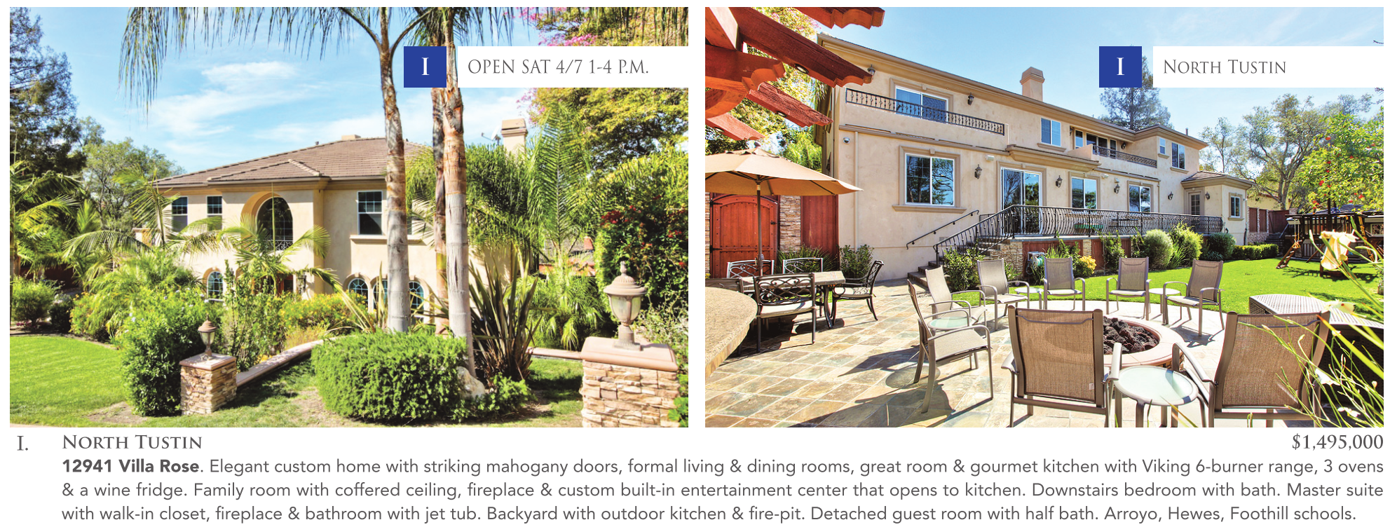 I. North Tustin $1,495,000 12941 Villa Rose. Elegant custom home with striking mahogany doors, formal living & dining rooms, great room & gourmet kitchen with Viking 6-burner range, 3 ovens