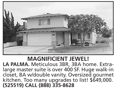LA PALMA. Meticulous 3BR, 3BA home. Extralarge master suite is over 400 SF. Huge walk-in closet, BA w/double vanity. Oversized gourmet kitchen. Too many upgrades to list! $649,000. (525519) CALL (888) 335-8628