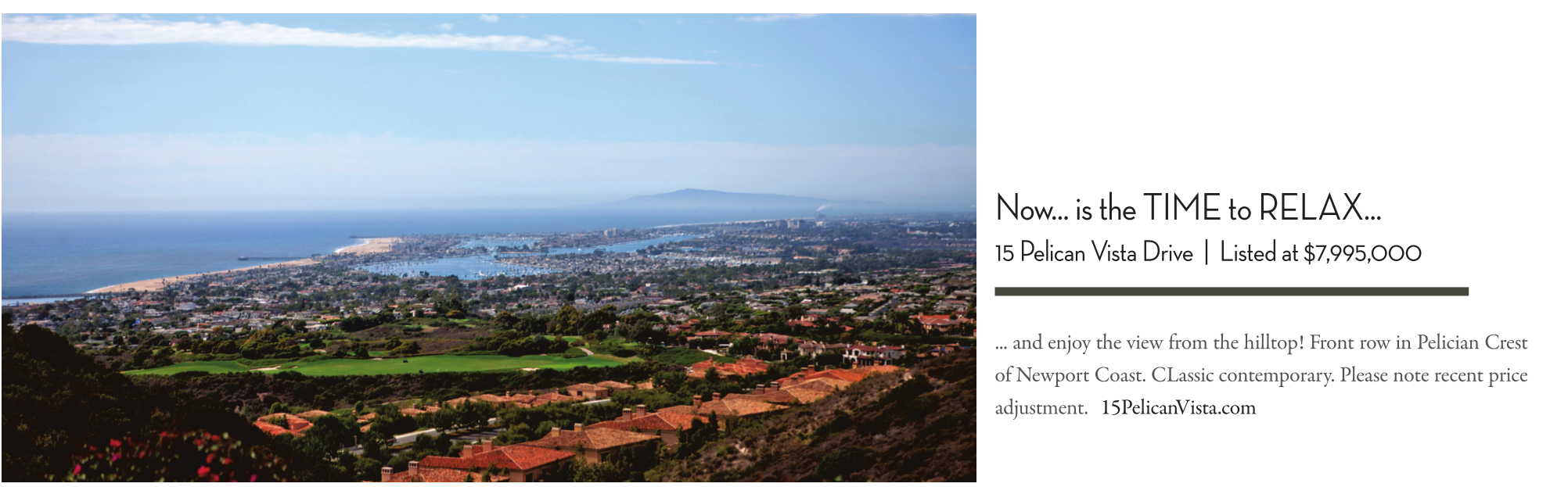... and enjoy the view from the hilltop! Front row in Pelician Crest of Newport Coast. CLassic contemporary. Please note recent price adjustment. 15PelicanVista.com