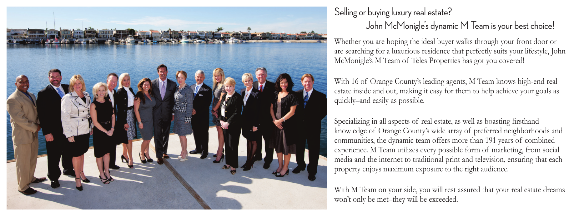 Specializing in all aspects of real estate, as well as boasting firsthand knowledge of Orange County’s wide array of preferred neighborhoods and communities, the dynamic team offers more than 191 years of combined experience. M Team utilizes every possible form of marketing, from social media and the internet to traditional print and television, ensuring that each property enjoys maximum exposure to the right audience.
