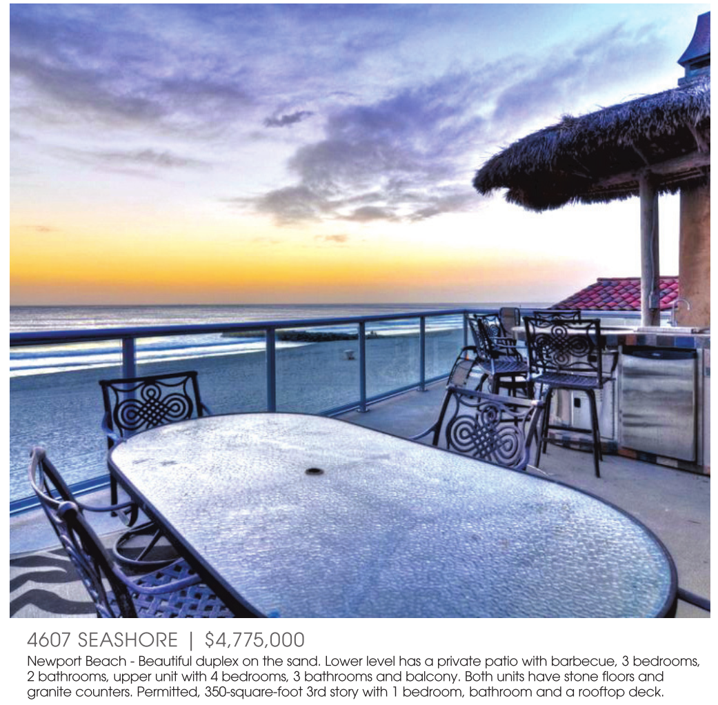 Newport Beach - Beautiful duplex on the sand. Lower level has a private patio with barbecue, 3 bedrooms, 2 bathrooms, upper unit with 4 bedrooms, 3 bathrooms and balcony. Both units have stone floors and granite counters. Permitted, 350-square-foot 3rd story with 1 bedroom, bathroom and a rooftop deck.