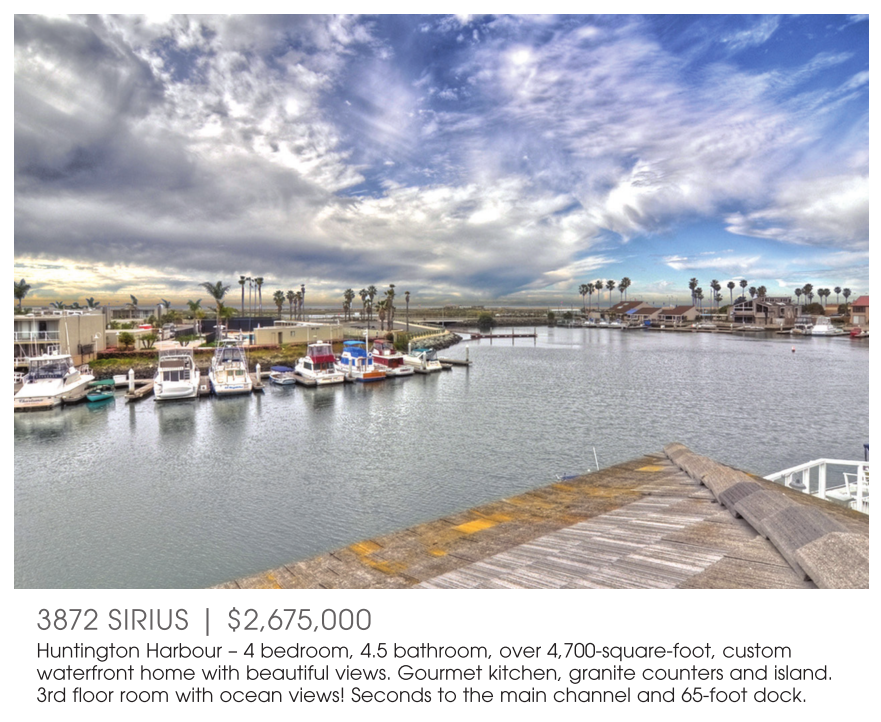3872 SIRIUS | $2,675,000 Huntington Harbour – 4 bedroom, 4.5 bathroom, over 4,700-square-foot, custom waterfront home with beautiful views. Gourmet kitchen, granite counters and island. 3rd floor room with ocean views! Seconds to the main channel and 65-foot dock.