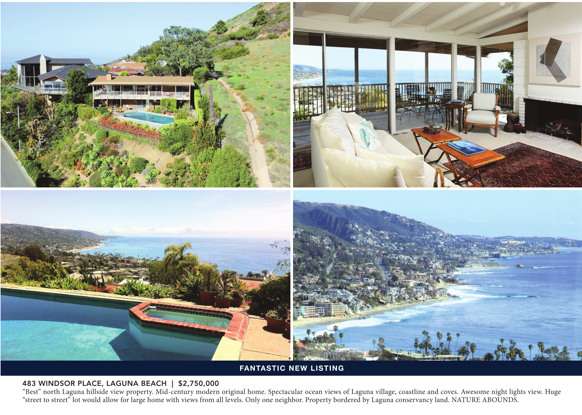 FANTASTIC NEW LISTING 483 WINDSOR PLACE, LAGUNA BEACH | $2,750,000 “Best” north Laguna hillside view property. Mid-century modern original home. Spectacular ocean views of Laguna village, coastline and coves. Awesome night lights view. Huge “street to street” lot would allow for large home with views from all levels. Only one neighbor. Property bordered by Laguna conservancy land. NATURE ABOUNDS.