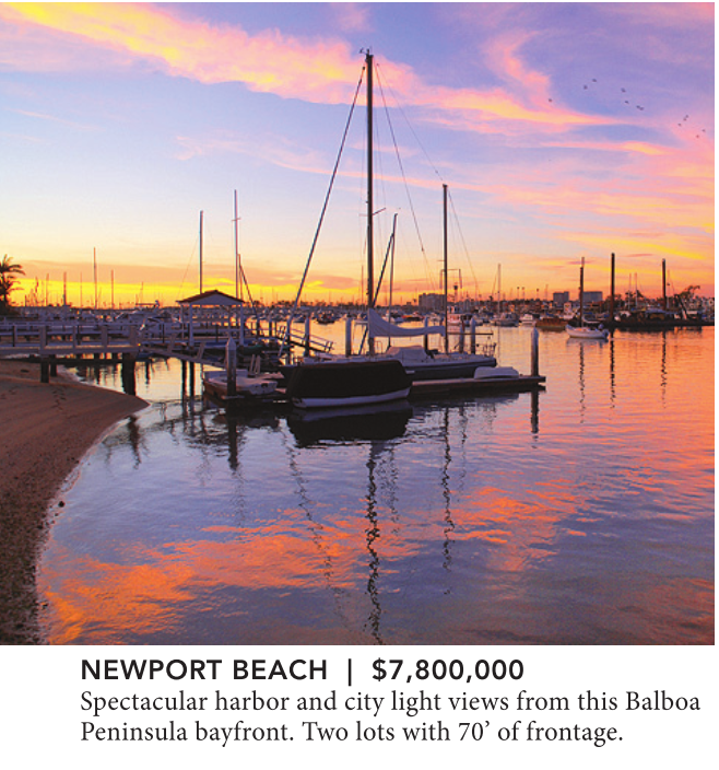NEWPORT BEACH | $7,800,000 Spectacular harbor and city light views from this Balboa Peninsula bayfront. Two lots with 70’ of frontage.