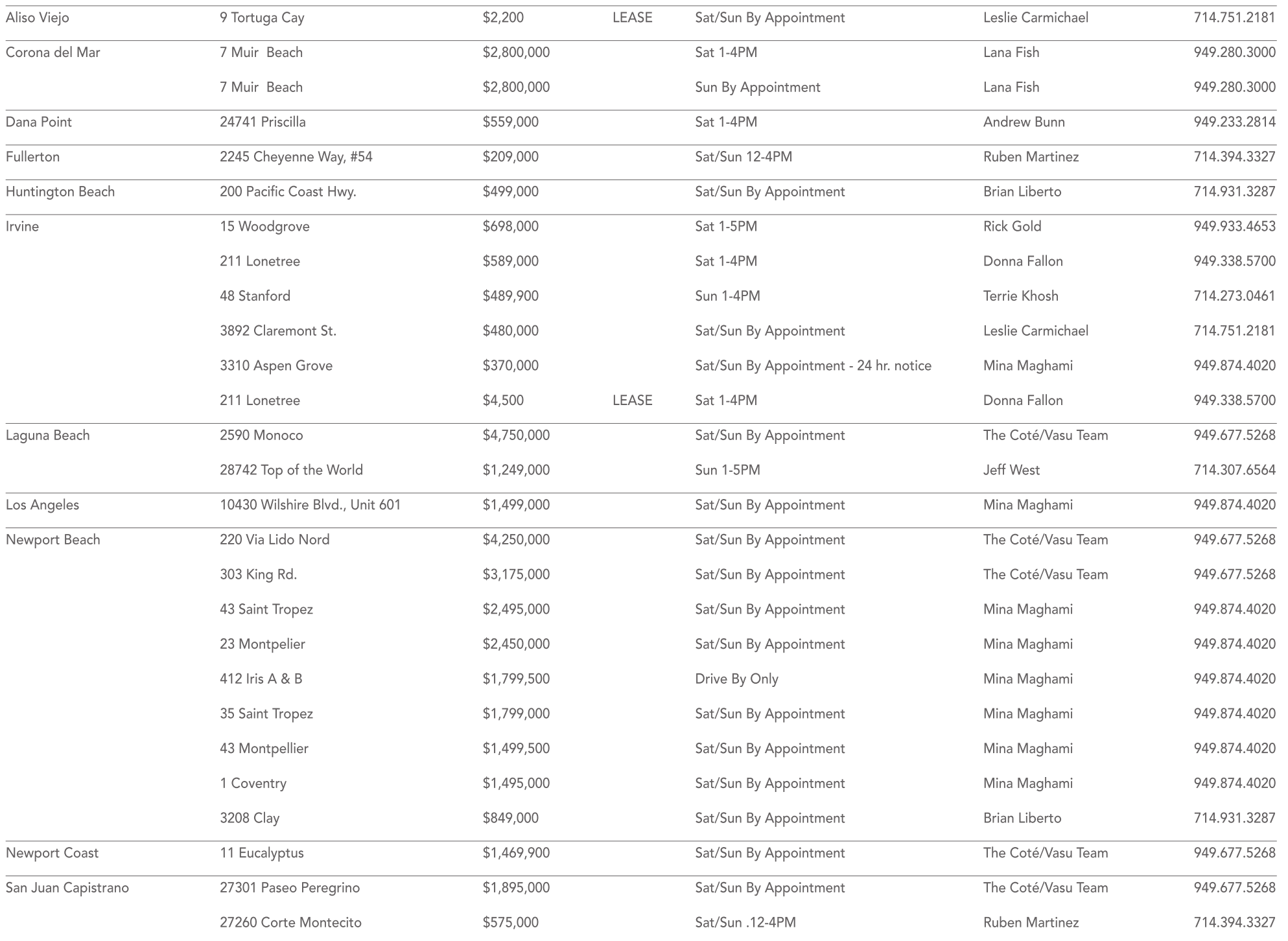 Huntington Beach 200 Pacific Coast Hwy. $499,000 Sat/Sun By Appointment Brian Liberto 714.931.3287 Irvine 15 Woodgrove $698,000 Sat 1-5PM Rick Gold 949.933.4653 211 Lonetree $589,000 Sat 1-4PM Donna Fallon 949.338.5700 48 Stanford $489,900 Sun 1-4PM Terrie Khosh 714.273.0461 3892 Claremont St. $480,000 Sat/Sun By Appointment Leslie Carmichael 714.751.2181 3310 Aspen Grove $370,000 Sat/Sun By Appointment - 24 hr. notice Mina Maghami 949.874.4020 211 Lonetree $4,500 LEASE Sat 1-4PM Donna Fallon 949.338.5700 Laguna Beach 2590 Monoco $4,750,000 Sat/Sun By Appointment The Coté/Vasu Team 949.677.5268 28742 Top of the World $1,249,000 Sun 1-5PM Jeff West 714.307.6564 Los Angeles 10430 Wilshire Blvd., Unit 601 $1,499,000 Sat/Sun By Appointment Mina Maghami 949.874.4020 Newport Beach 220 Via Lido Nord $4,250,000 Sat/Sun By Appointment The Coté/Vasu Team 949.677.5268 303 King Rd. $3,175,000 Sat/Sun By Appointment The Coté/Vasu Team 949.677.5268 43 Saint Tropez $2,495,000 Sat/Sun By Appointment Mina Maghami 949.874.4020 23 Montpelier $2,450,000 Sat/Sun By Appointment Mina Maghami 949.874.4020 412 Iris A & B $1,799,500 Drive By Only Mina Maghami 949.874.4020 35 Saint Tropez $1,799,000 Sat/Sun By Appointment Mina Maghami 949.874.4020 43 Montpellier $1,499,500 Sat/Sun By Appointment Mina Maghami 949.874.4020 1 Coventry $1,495,000 Sat/Sun By Appointment Mina Maghami 949.874.4020 3208 Clay $849,000 Sat/Sun By Appointment Brian Liberto 714.931.3287 Newport Coast 11 Eucalyptus $1,469,900 Sat/Sun By Appointment The Coté/Vasu Team 949.677.5268 San Juan Capistrano 27301 Paseo Peregrino $1,895,000 Sat/Sun By Appointment The Coté/Vasu Team 949.677.5268 27260 Corte Montecito $575,000 Sat/Sun .12-4PM Ruben Martinez 714.394.3327