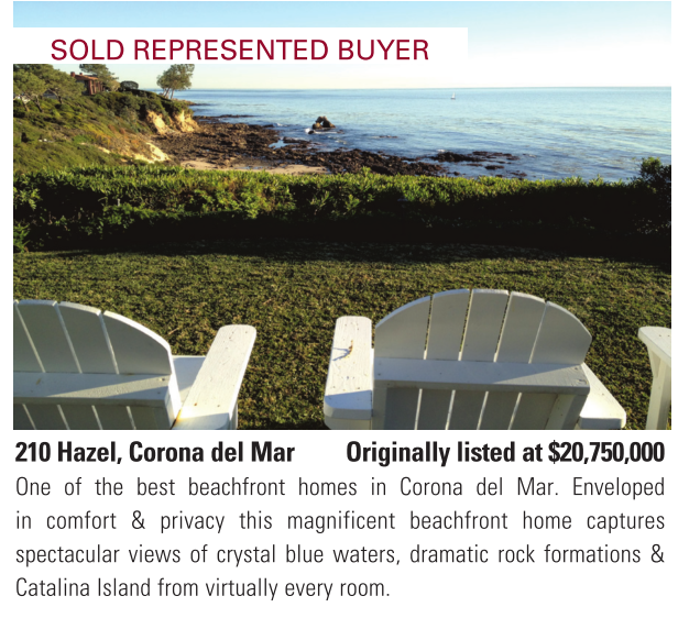210 Hazel, Corona del Mar Originally listed at $20,750,000 One of the best beachfront homes in Corona del Mar. Enveloped in comfort & privacy this magnificent beachfront home captures spectacular views of crystal blue waters, dramatic rock formations & Catalina Island from virtually every room.