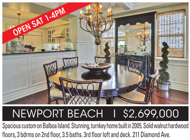 Spacious custom on Balboa Island. Stunning, turnkey home built in 2005. Solid walnut hardwood floors, 3 bdrms on 2nd floor, 3.5 baths. 3rd floor loft and deck. 211 Diamond Ave.