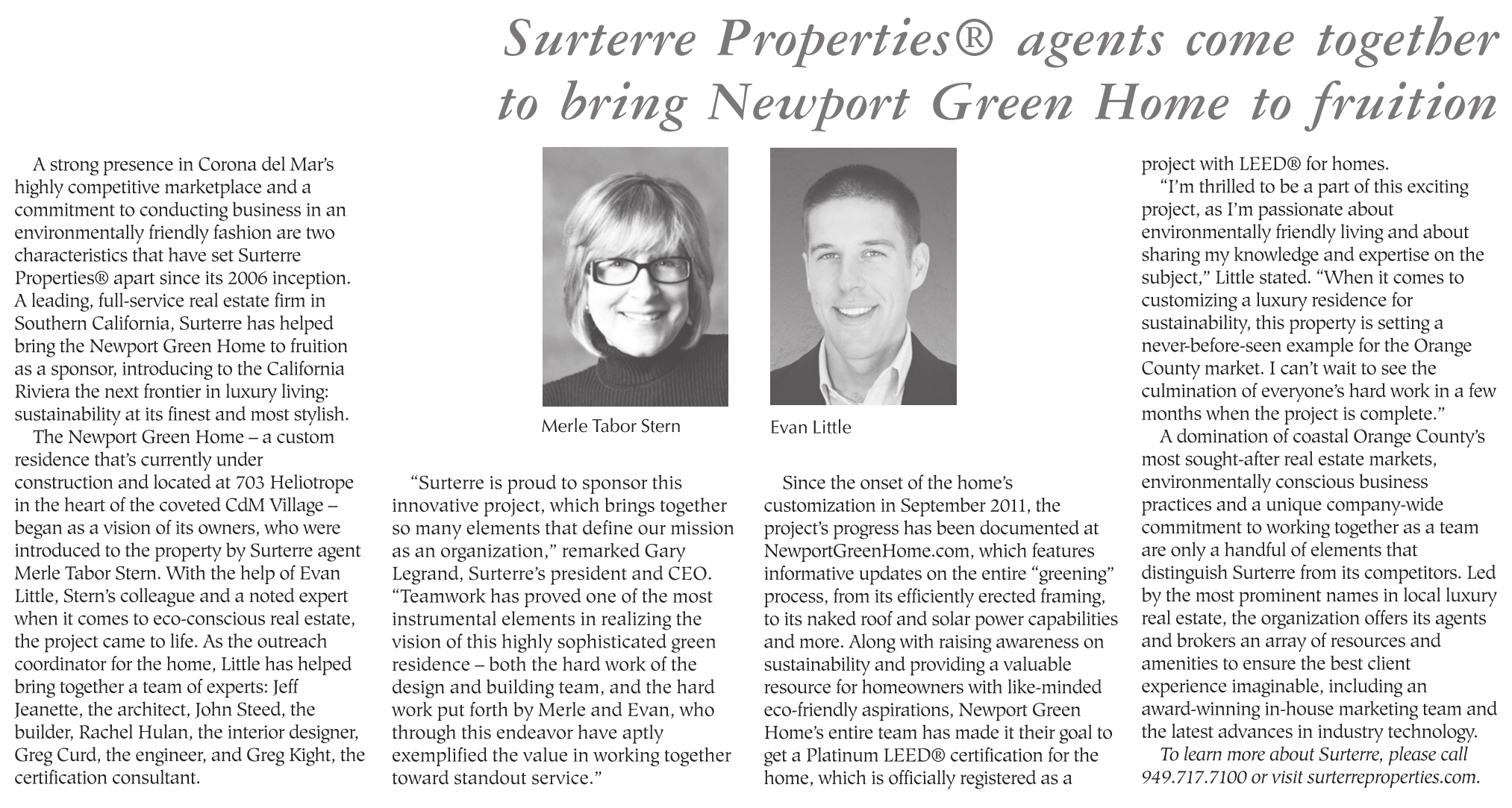 A strong presence in Corona del Mar’s highly competitive marketplace and a commitment to conducting business in an environmentally friendly fashion are two characteristics that have set Surterre Properties® apart since its 2006 inception. A leading, full-service real estate firm in Southern California, Surterre has helped bring the Newport Green Home to fruition as a sponsor, introducing to the California Riviera the next frontier in luxury living: sustainability at its finest and most stylish.
