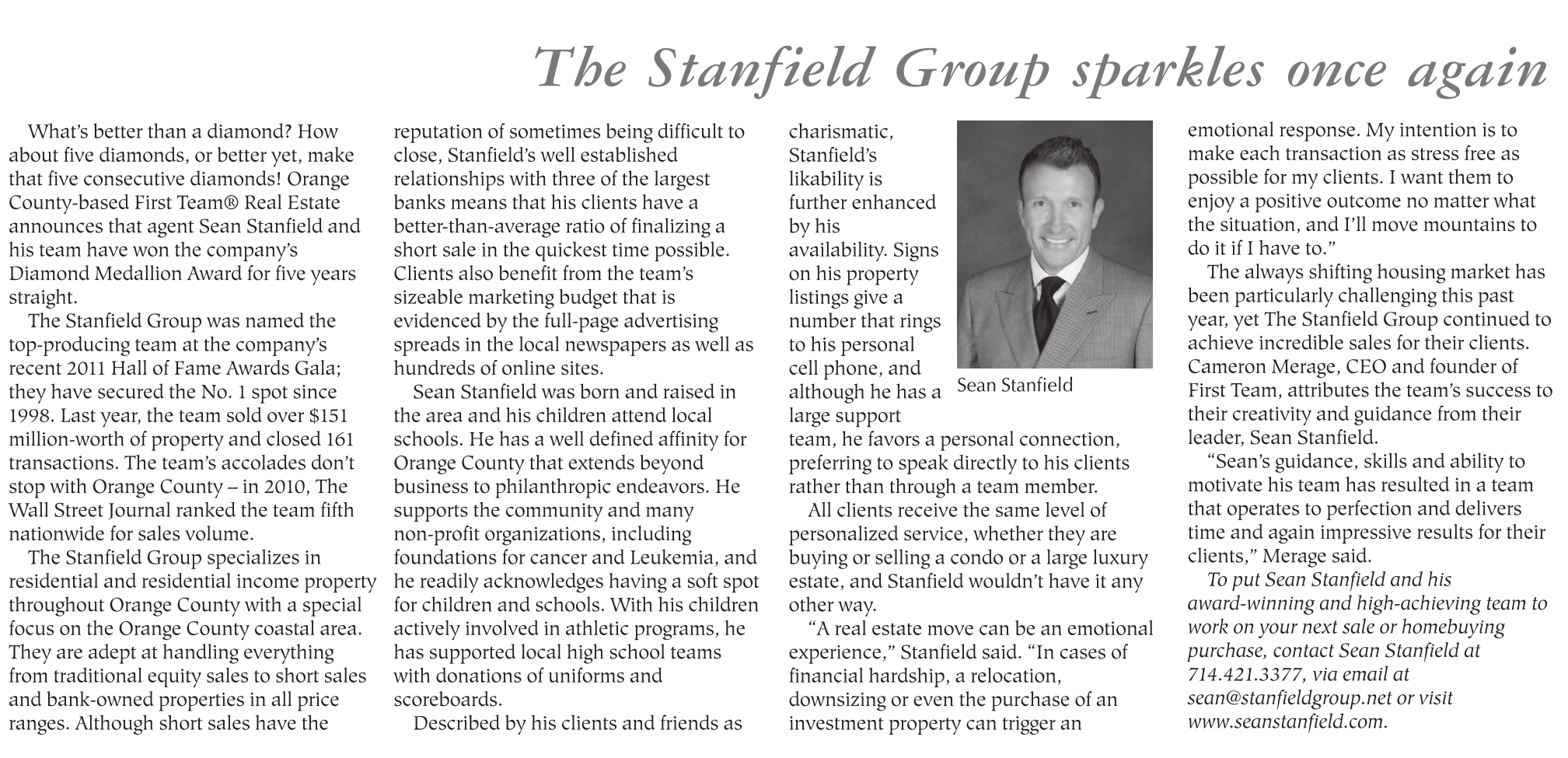 To put Sean Stanfield and his award-winning and high-achieving team to work on your next sale or homebuying purchase, contact Sean Stanfield at 714.421.3377, via email at sean@stanfieldgroup.net or visit www.seanstanfield.com.
