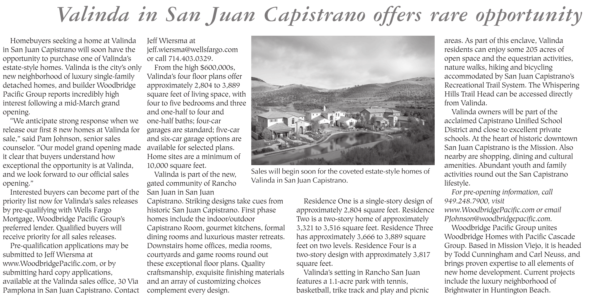 Homebuyers seeking a home at Valinda in San Juan Capistrano will soon have the opportunity to purchase one of Valinda’s estate-style homes. Valinda is the city’s only new neighborhood of luxury single-family detached homes, and builder Woodbridge Pacific Group reports incredibly high interest following a mid-March grand opening.