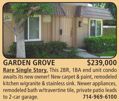 GARDEN GROVE $239,000 Rare Single Story. This 2BR, 1BA end unit condo