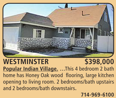 home has Honey Oak wood fl ooring, large kitchen opening to living room. 2 bedrooms/bath upstairs and 2 bedrooms/bath downstairs. 714-969-6100