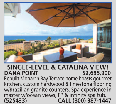 SINGLE-LEVEL & CATALINA VIEW! DANA POINT $2,695,900 Rebuilt Monarch Bay Terrace home boasts gourmet kitchen, custom hardwood & limestone flooring w/Brazilian granite counters. Spa experience in master w/ocean views, FP & infinity spa tub. (525433) CALL (800) 387-1447