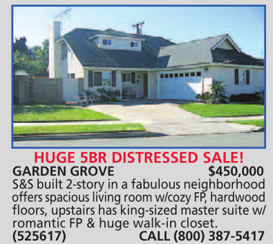 HUGE 5BR DISTRESSED SALE! GARDEN GROVE $450,000 S&S built 2-story in a fabulous neighborhood offers spacious living room w/cozy FP, hardwood floors, upstairs has king-sized master suite w/ romantic FP & huge walk-in closet. (525617) CALL (800) 387-5417