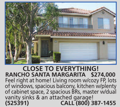RANCHO SANTA MARGARITA $274,000 Feel right at home! Living room w/cozy FP, lots of windows, spacious balcony, kitchen w/plenty of cabinet space, 2 spacious BRs, master w/dual vanity sinks & an attached garage! (525391) CALL (800) 387-1455