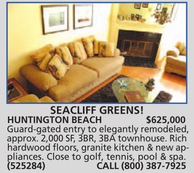 HUNTINGTON BEACH $625,000 Guard-gated entry to elegantly remodeled, approx. 2,000 SF, 3BR, 3BA townhouse. Rich hardwood floors, granite kitchen & new appliances. Close to golf, tennis, pool & spa.