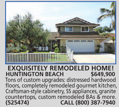 EXQUISITELY REMODELED HOME! HUNTINGTON BEACH $649,900 Tons of custom upgrades: distressed hardwood floors, completely remodeled gourmet kitchen, Craftsman-style cabinetry, SS appliances, granite countertops, custom remodeled BAs & more. (525474) CALL (800) 387-7940