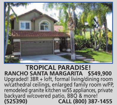 RANCHO SANTA MARGARITA $549,900 Upgraded! 3BR + loft, formal living/dining room w/cathedral ceilings, enlarged family room w/FP, remodeled granite kitchen w/SS appliances, private backyard w/covered patio, BBQ & more! (525390) CALL (800) 387-1455