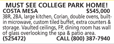MUST SEE COLLEGE PARK HOME! COSTA MESA $545,000 3BR, 2BA, large kitchen, Corian, double ovens, builtin microwave, custom tiled buffet, extra counters & storage. Vaulted ceilings, FP, dining room has wall of glass overlooking the spa & patio area. (525472) CALL (800) 387-7940