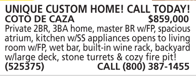 UNIQUE CUSTOM HOME! CALL TODAY! COTO DE CAZA $859,000 Private 2BR, 3BA home, master BR w/FP, spacious atrium, kitchen w/SS appliances opens to living room w/FP, wet bar, built-in wine rack, backyard w/large deck, stone turrets & cozy fire pit! (525375) CALL (800) 387-1455